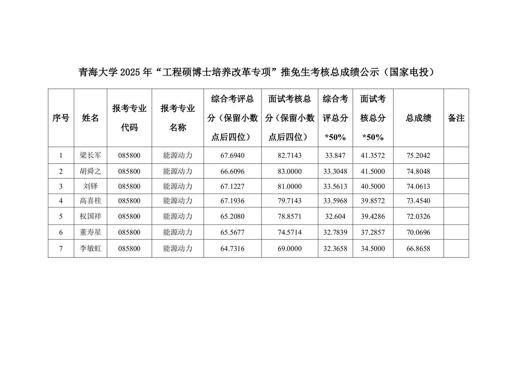 能源动力工程硕士专项计划考核成绩公示