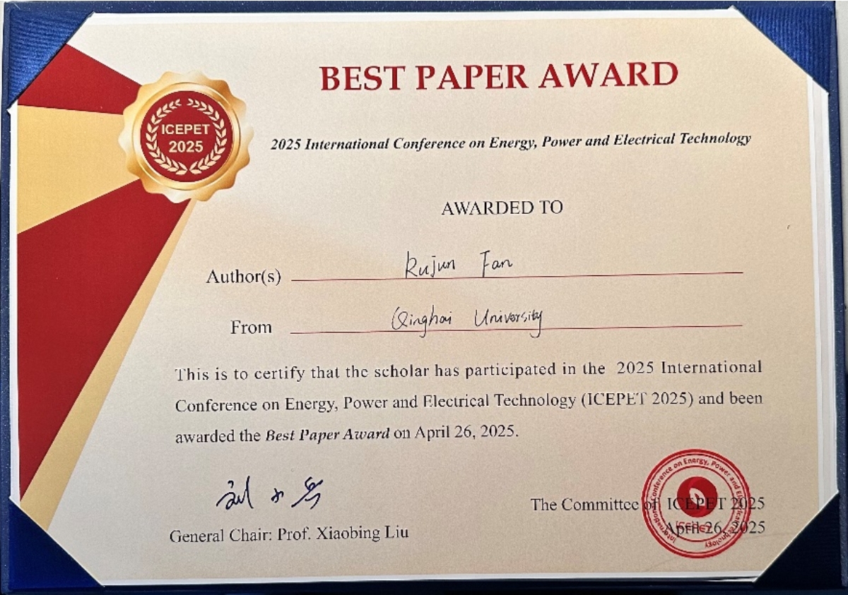 2025年4月25日至27日,第四届能源、电力与电气国际学术会议(ICEPET 2025)在成都召开。裸聊直播 热电氢储联合优化团队汇报了虚拟电厂结合基于工业余热压缩空气储能优化运行方向的最新研究成果。我校研究生范如俊同学的论文“Optimal operation of virtual power plant based on industrial waste heat compressed air energy storage-photovoltaic power plant”荣获优秀论文奖。